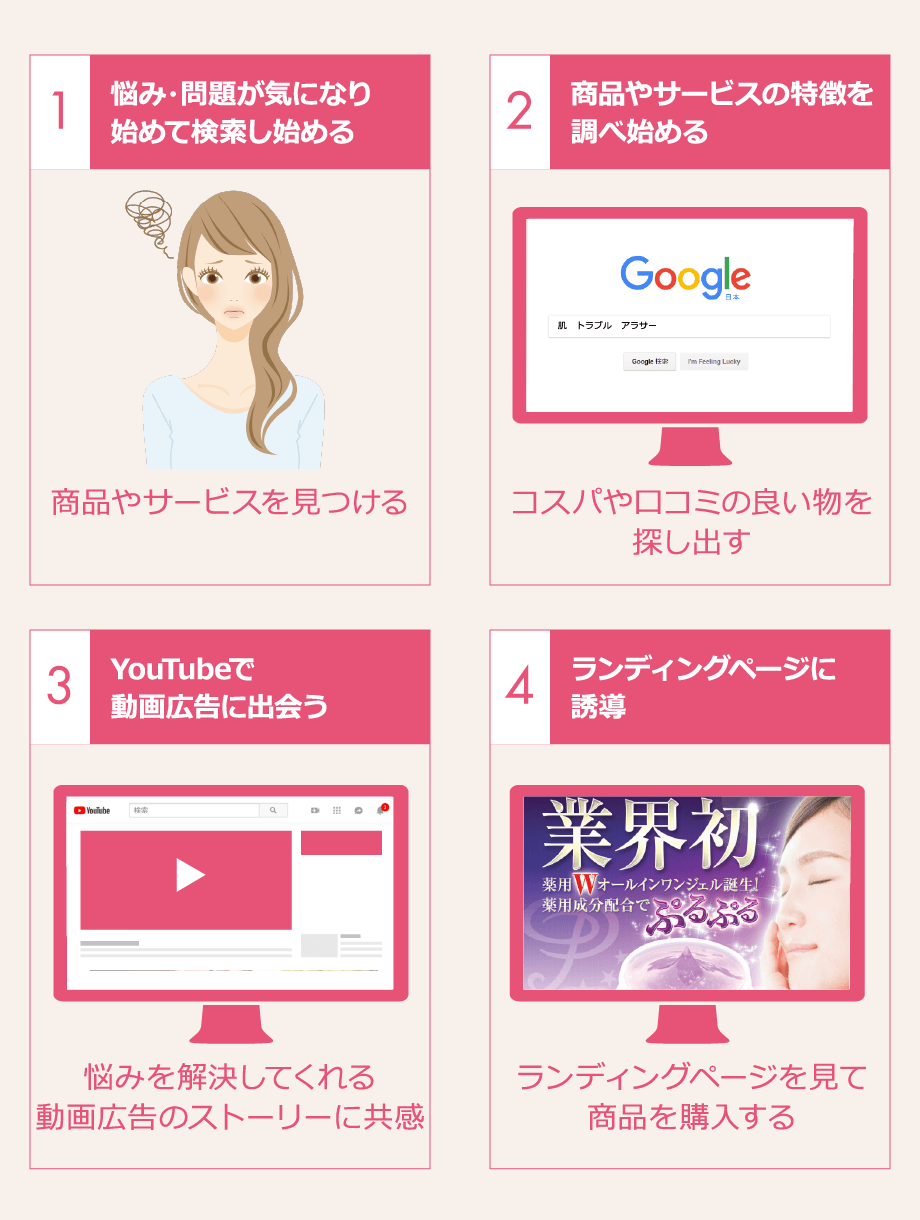 A子さんが、「最初に商品・サービスが必要だと感じたきっかけ」⇒「キーワード検索」⇒「YouTubeで動画広告に出会う」⇒「実際にランディングページに到達する」までのストーリーをイメージしていきます。